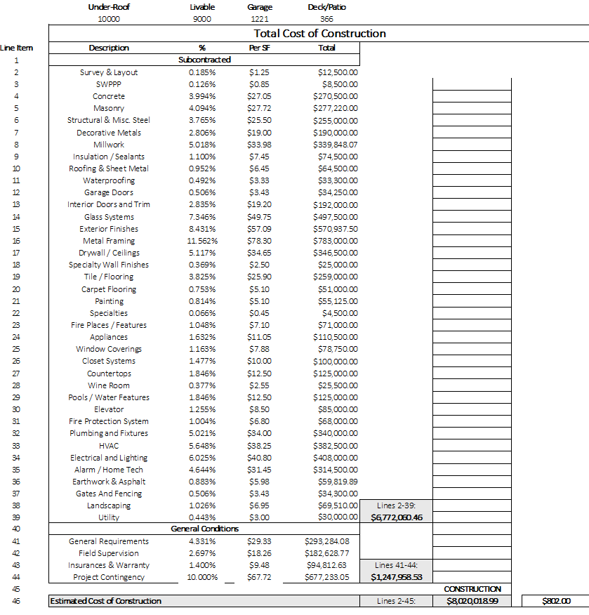 COST OF CONSTRUCTION Cost of Finishes Back to Total Profit and Cost Summary Back to Lot TBD Back to Home